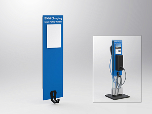 L 565 x W 560 x H 1,780 mm, steel base construction black powder-coated incl. adjustable feet, base cover powder-coated DB703, aluminium facing silver anodised, glass pedestal W 350 x 15 mm made of ESG white glass, swivel parts made of stainless steel. Please note: The adapter plates BMW Wallbox, Flexible Fast Charger, Mode 3 cable and Smart Partner Wallbox must be ordered separately. The wallboxes / display elements used must also be ordered separately. These are not included in the scope of delivery.