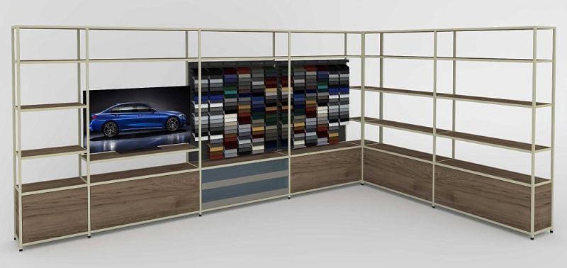 The shelving system fosters a warm and comfortable atmosphere where customers feel welcome and in-depth consultations can take place. The focus remains on the displayed vehicles and personalized customer service.